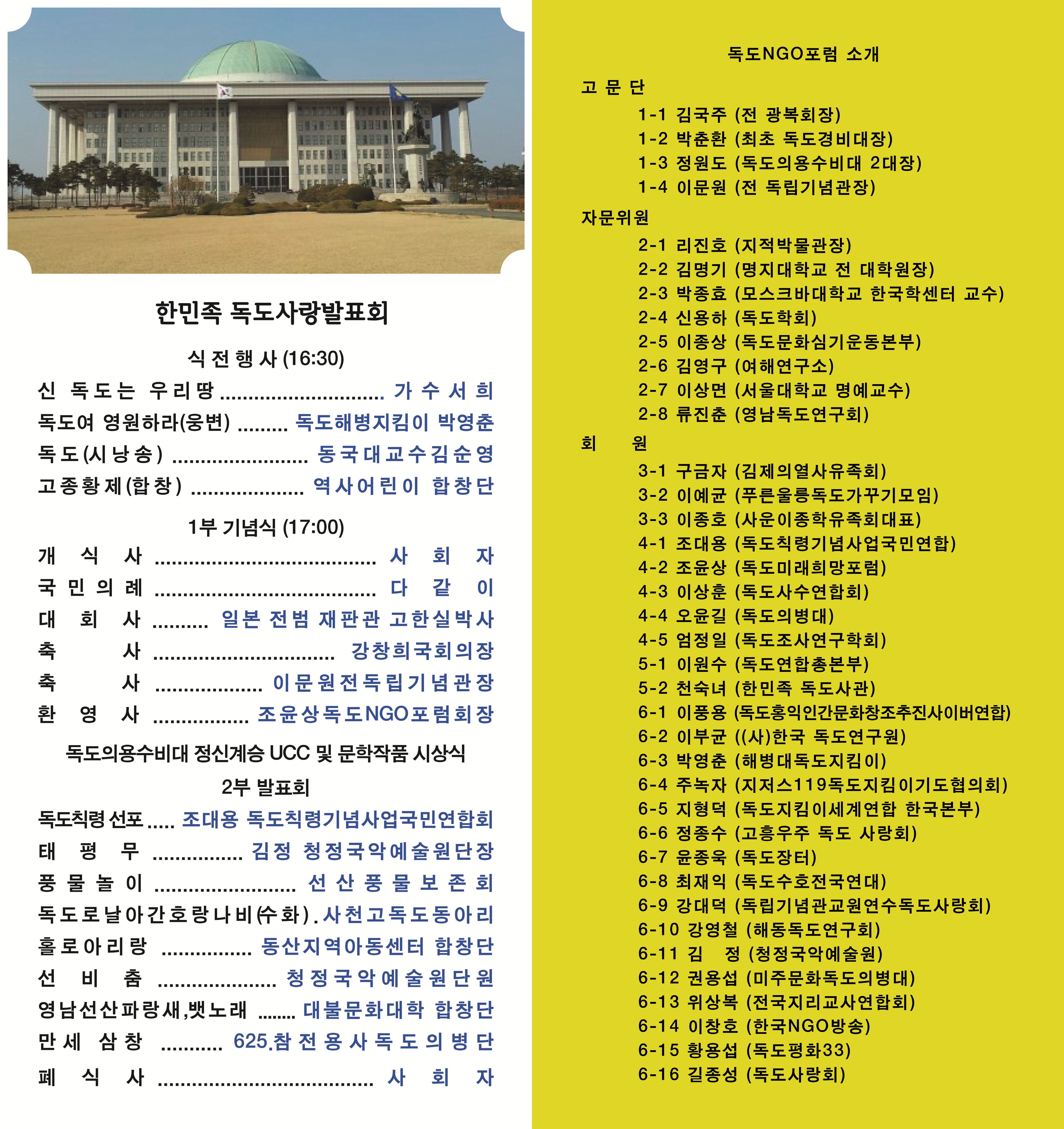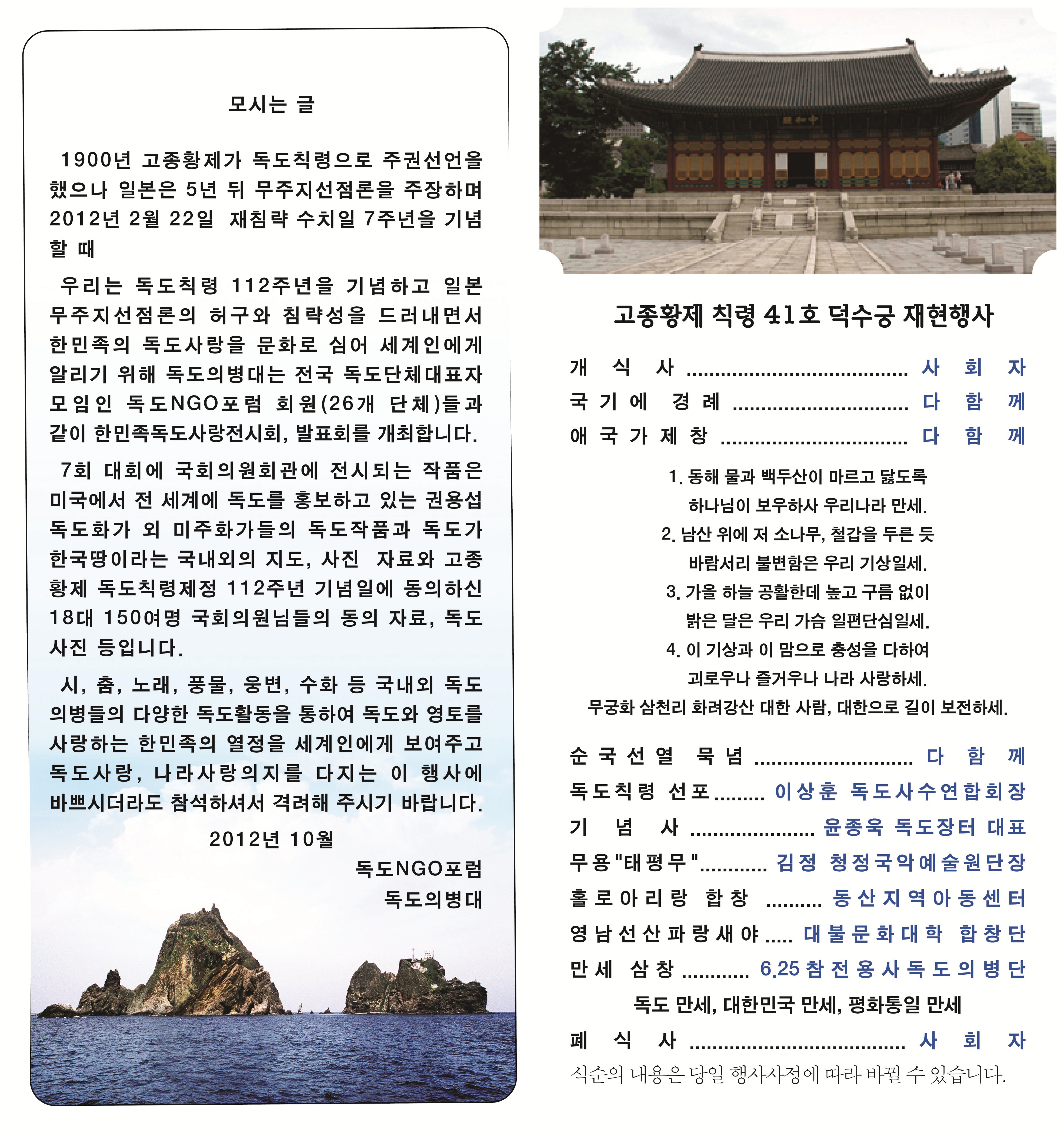 ¿ì¸®´Â µ¶µµÄ¢·É 112ÁÖ³âÀ» ±â³äÇϰí ÀϺ» ¹«ÁÖÁö¼±Á¡·ÐÀÇ Ç㱸¿Í ħ·«¼ºÀ» µå·¯³»¸é¼ ÇѹÎÁ·ÀÇ µ¶µµ»ç¶ûÀ» ¹®È·Î ½É¾î ¼¼°èÀο¡°Ô ¾Ë¸®±â À§ÇØ µ¶µµÀǺ´´ë´Â Àü±¹ µ¶µµ´Üü´ëÇ¥ÀÚ ¸ðÀÓÀÎ µ¶µµNGOÆ÷·³ ȸ¿ø(26°³ ´Üü)µé°ú °°ÀÌ ÇѹÎÁ·µ¶µµ»ç¶ûÀü½Ãȸ, ¹ßǥȸ¸¦ °³ÃÖÇÕ´Ï´Ù.